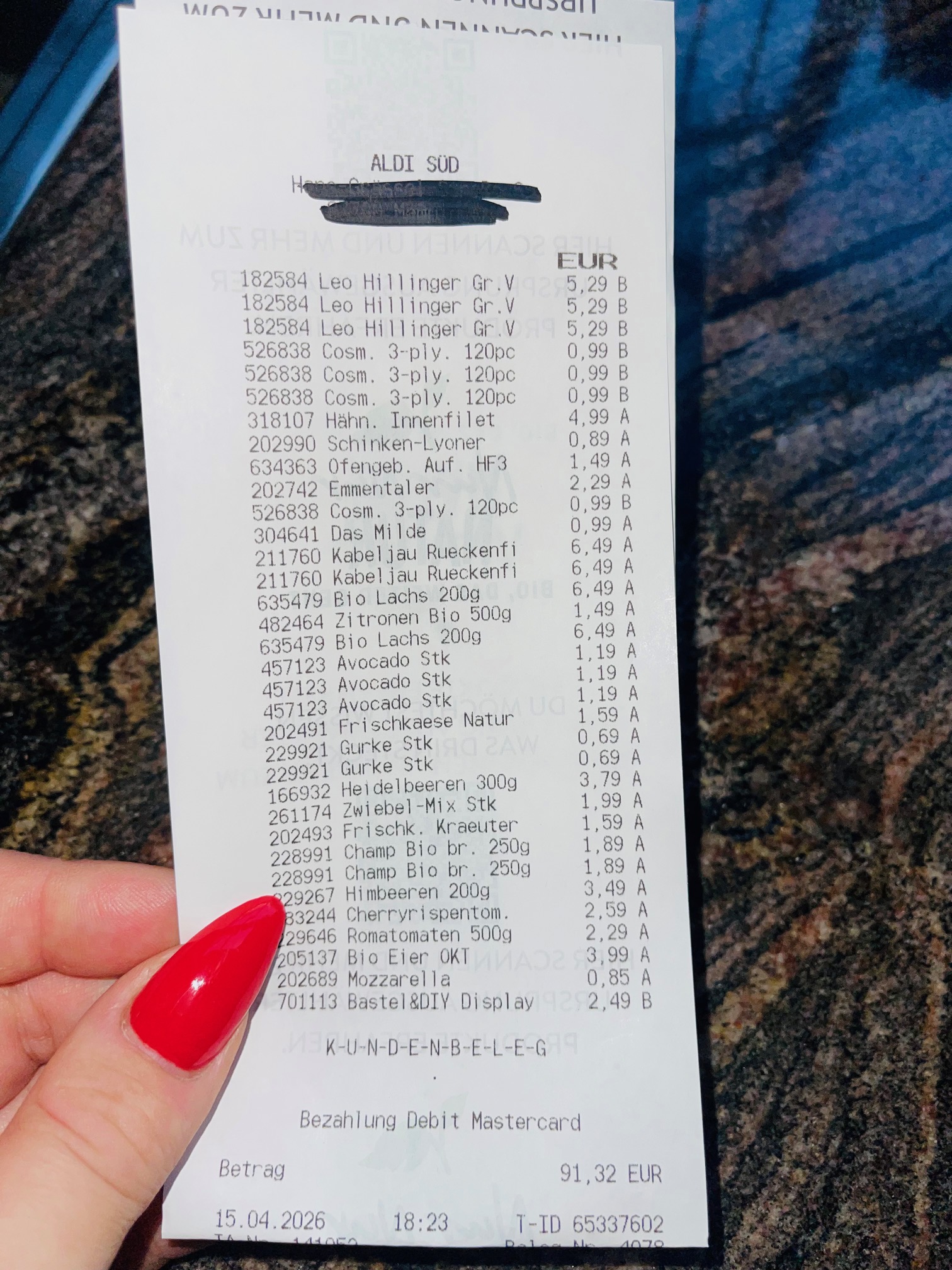 Einkaufen Aldi 60,38 Euro 15.04.26 Mariella