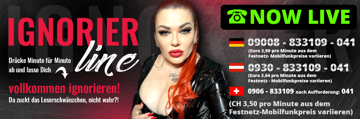 Willkommen in meiner Ingore/Ignorier ****line! Diese Melkline habe ich deswegen ins Leben gerufen, um noch mehr Geld von euch Losern abzucashen, ohne auch nur einen Finger dafür zu rühren! Du erreichst mich 24/7 in meiner geilen Ignoreline und hast so die Möglichkeit, auch (d)einen lächerlich geringen Teil zu meinem dekadenten, verschwenderischen Luxuslifestyle beizutragen, denn auch Kleinvieh macht Mist.
