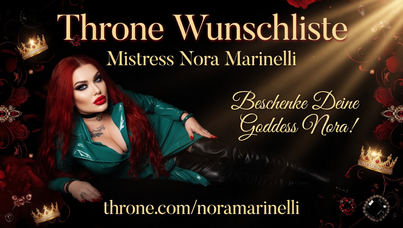 Ich bin Goddess Nora Marinelli, deine glamouröse Manipulatrix, die Elite-Findom mit Klasse. Jedes Teil auf dieser Liste ist nicht nur ein Wunsch – es ist ein Befehl. Ein Tribut an meine Überlegenheit. Mit jedem Kauf sinkst du tiefer, gibst du mehr auf und fühlst du, wie ich dich noch fester in meinen perfekt manikürten Fingern halte.