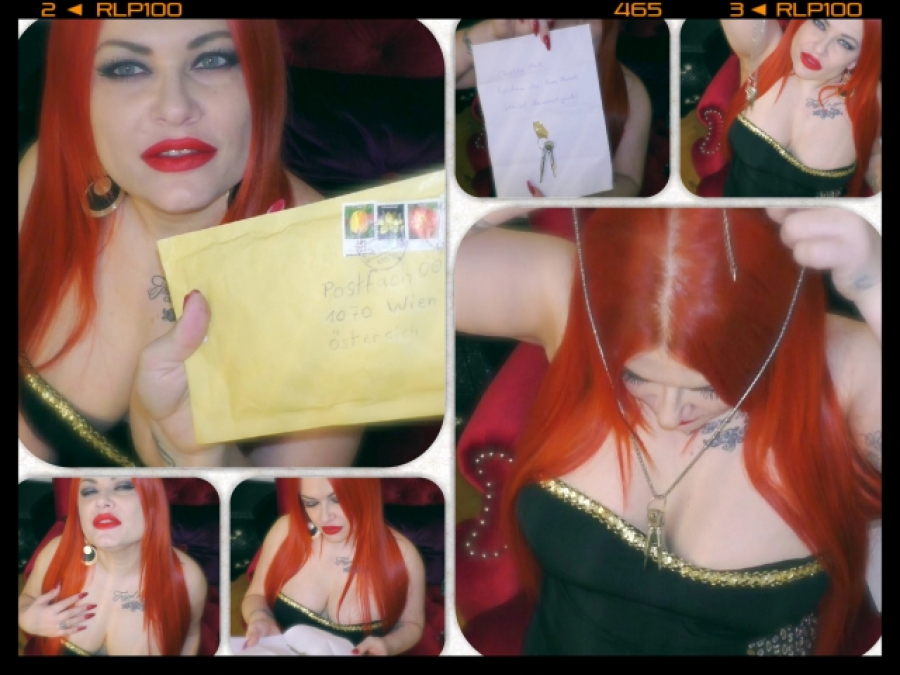 Ich öffne "Live" in diesem Clip das mir zugesendete Kuvert und nehme die Schlüssel für den Keuschaltekäfig an mich! Um meinen armen Keuschling an den Rande des Wahnsinns zu treiben, hänge ich die KG-Schlüssel an eine Halskette, sodass der Schlüssel genau zwischen meinen großen, prallen Brüsten baumelt...haha!